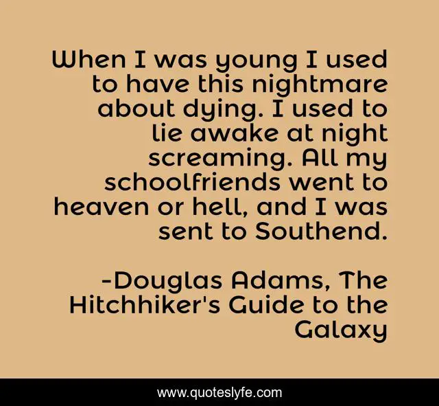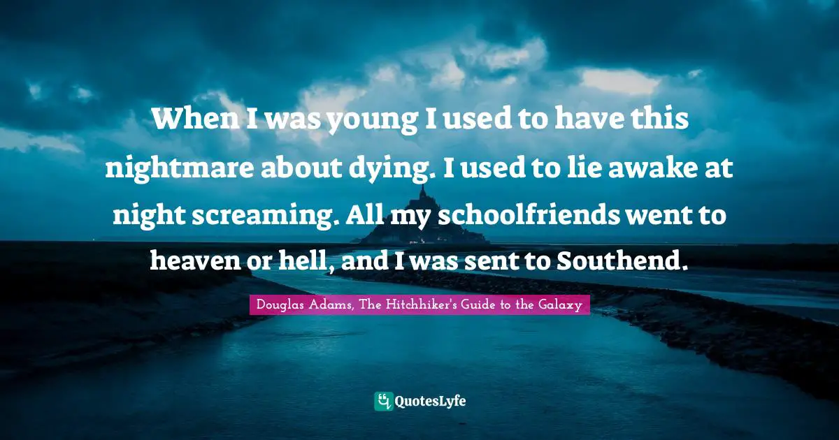 This page presents the quote "When I was young I used to have this nightmare about dying. I used to lie awake at night screaming. All my schoolfriends went to heaven or hell, and I was sent to Southend.". Author of this quote is Douglas Adams, The Hitchhiker's Guide to the Galaxy. This quote is about hell, southend, heaven,.