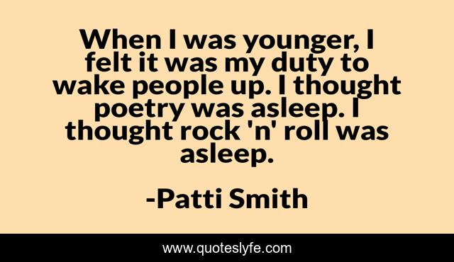 This page presents the quote "When I was younger, I felt it was my duty to wake people up. I thought poetry was asleep. I thought rock 'n' roll was asleep.". Author of this quote is Patti Smith. This quote is about thought, people, rock,.