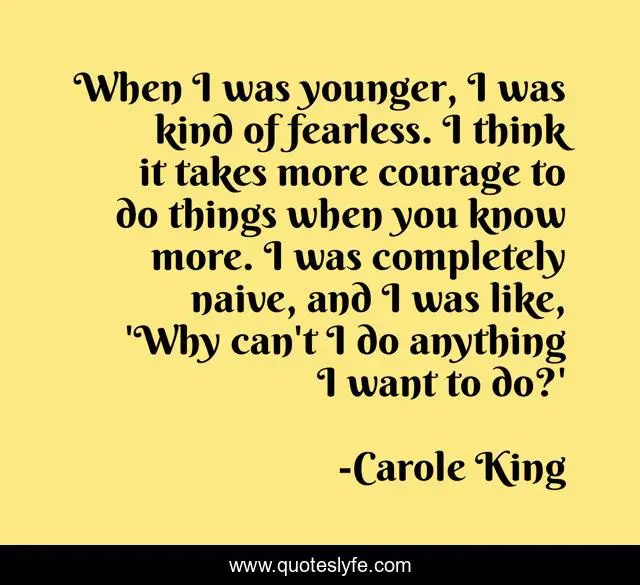 This page presents the quote "When I was younger, I was kind of fearless. I think it takes more courage to do things when you know more. I was completely naive, and I was like, 'Why can't I do anything I want to do?'". Author of this quote is Carole King. .