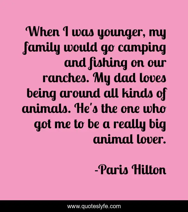 This page presents the quote "When I was younger, my family would go camping and fishing on our ranches. My dad loves being around all kinds of animals. He's the one who got me to be a really big animal lover.". Author of this quote is Paris Hilton. This quote is about me, fishing, animal,.