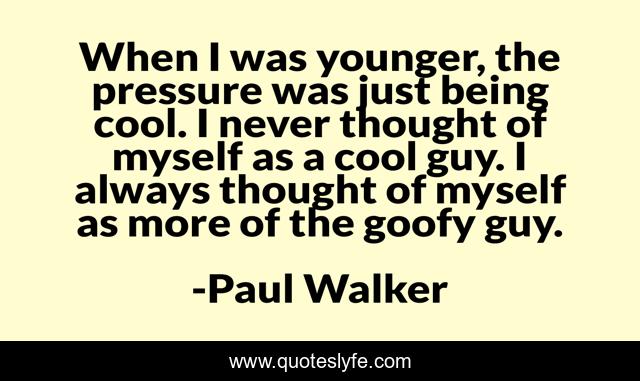This page presents the quote "When I was younger, the pressure was just being cool. I never thought of myself as a cool guy. I always thought of myself as more of the goofy guy.". Author of this quote is Paul Walker. This quote is about thought, pressure, myself,.