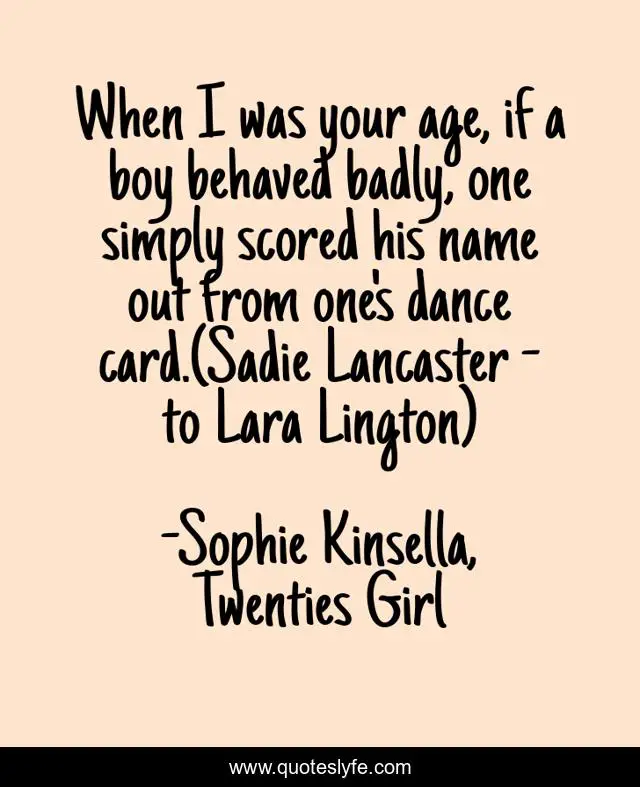 This page presents the quote "When I was your age, if a boy behaved badly, one simply scored his name out from one's dance card.(Sadie Lancaster - to Lara Lington)". Author of this quote is Sophie Kinsella, Twenties Girl. .