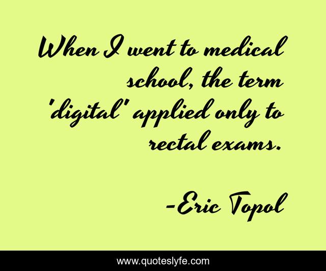 This page presents the quote "When I went to medical school, the term 'digital' applied only to rectal exams.". Author of this quote is Eric Topol. This quote is about school, digital,.