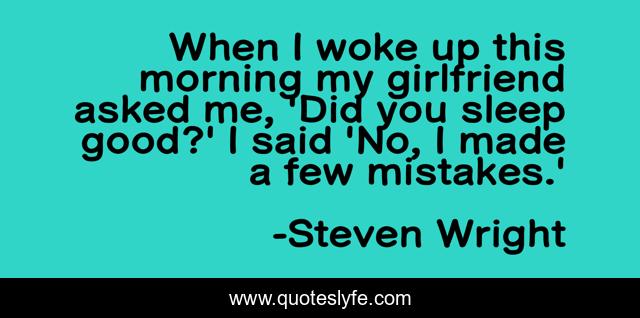 This page presents the quote "When I woke up this morning my girlfriend asked me, 'Did you sleep good?' I said 'No, I made a few mistakes.'". Author of this quote is Steven Wright. This quote is about good, mistakes, sleep,.
