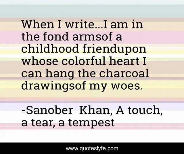 This page presents the quote "When I write...I am in the fond armsof a childhood friendupon whose colorful heart I can hang the charcoal drawingsof my woes.". Author of this quote is Sanober Khan, A touch, a tear, a tempest. This quote is about charcoal, woes, colorful, heart, arms, poetry, writers, drawing, writing,.