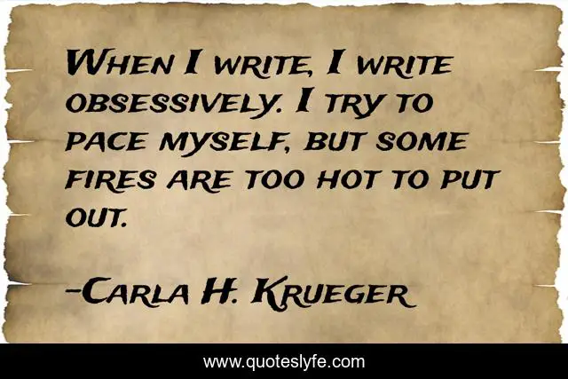 This page presents the quote "When I write, I write obsessively. I try to pace myself, but some fires are too hot to put out.". Author of this quote is Carla H. Krueger. This quote is about writing-life, writing-from-the-heart, writing-process, writing, writers, writing-philosophy, writers-on-writing, carla-h-krueger,.