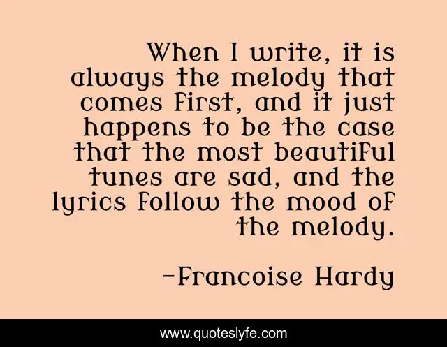 This page presents the quote "When I write, it is always the melody that comes first, and it just happens to be the case that the most beautiful tunes are sad, and the lyrics follow the mood of the melody.". Author of this quote is Francoise Hardy. This quote is about beautiful, most beautiful,.