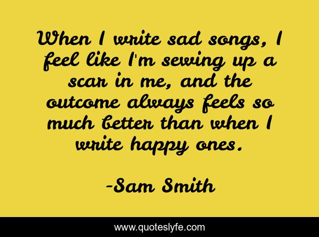 This page presents the quote "When I write sad songs, I feel like I'm sewing up a scar in me, and the outcome always feels so much better than when I write happy ones.". Author of this quote is Sam Smith. This quote is about me, better, happy,.
