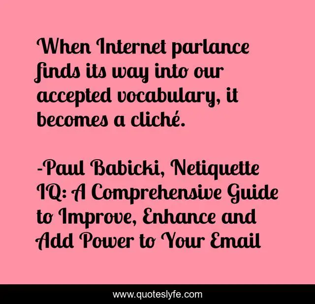 This page presents the quote "When Internet parlance finds its way into our accepted vocabulary, it becomes a cliché.". Author of this quote is Paul Babicki, Netiquette IQ: A Comprehensive Guide to Improve, Enhance and Add Power to Your Email. This quote is about marketing-advice, vocabulary, etiquette, communication, netiquette, email,.