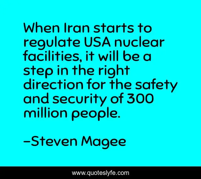This page presents the quote "When Iran starts to regulate USA nuclear facilities, it will be a step in the right direction for the safety and security of 300 million people.". Author of this quote is Steven Magee. This quote is about fda, iran, reactor, usa, nuclear, utilities, osha, electrical, safety,.