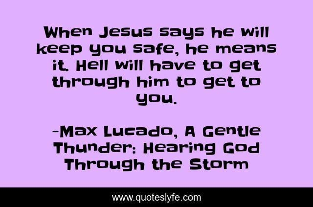 This page presents the quote "When Jesus says he will keep you safe, he means it. Hell will have to get through him to get to you.". Author of this quote is Max Lucado, A Gentle Thunder: Hearing God Through the Storm. This quote is about a-gentle-thunder, jesus, safety, max-lucado, hell, security,.