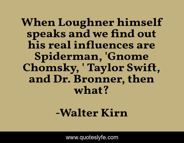This page presents the quote "When Loughner himself speaks and we find out his real influences are Spiderman, 'Gnome Chomsky, ' Taylor Swift, and Dr. Bronner, then what?". Author of this quote is Walter Kirn. This quote is about presumption, taylor-swift, spiderman, 2011-tuscon-shooting, twitter, noam-chomsky, emanuel-bronner, politics, jared-lee-loughner,.
