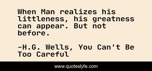 This page presents the quote "When Man realizes his littleness, his greatness can appear. But not before.". Author of this quote is H.G. Wells, You Can't Be Too Careful. This quote is about humbleness, humans, humanity,.
