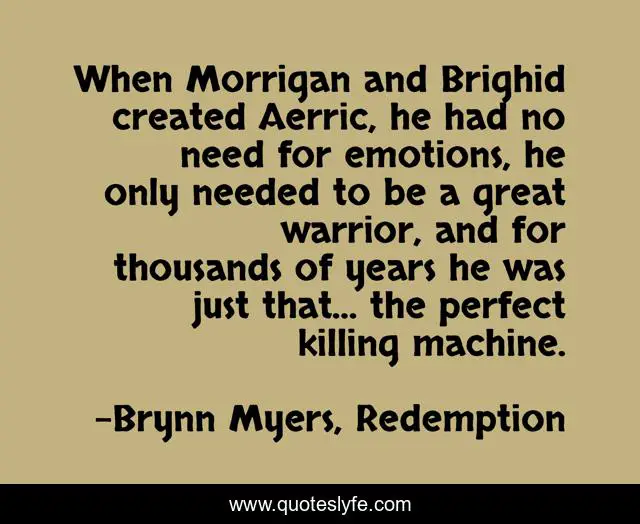 This page presents the quote "When Morrigan and Brighid created Aerric, he had no need for emotions, he only needed to be a great warrior, and for thousands of years he was just that… the perfect killing machine.". Author of this quote is Brynn Myers, Redemption. This quote is about goddesses, phoenix, demons, dragons, paranormal-urban-fantasy, mythology,.