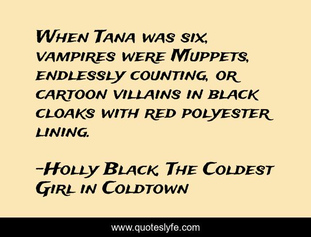 This page presents the quote "When Tana was six, vampires were Muppets, endlessly counting, or cartoon villains in black cloaks with red polyester lining.". Author of this quote is Holly Black, The Coldest Girl in Coldtown. .