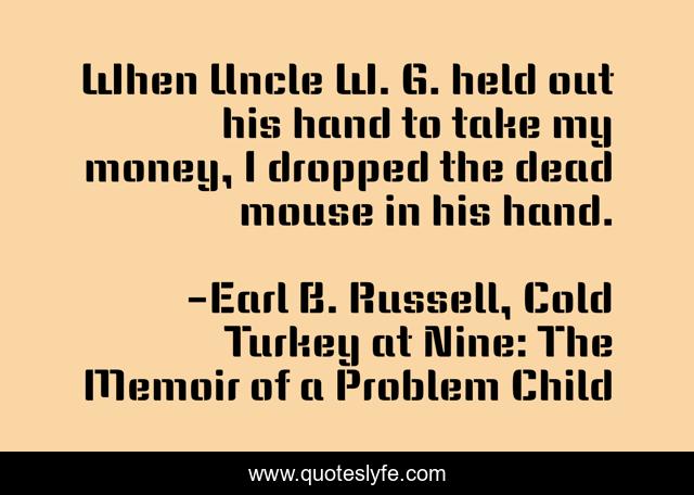 This page presents the quote "When Uncle W. G. held out his hand to take my money, I dropped the dead mouse in his hand.". Author of this quote is Earl B. Russell, Cold Turkey at Nine: The Memoir of a Problem Child. This quote is about humorous, childhood-memories, pranks, family-relationships, growing-up,.