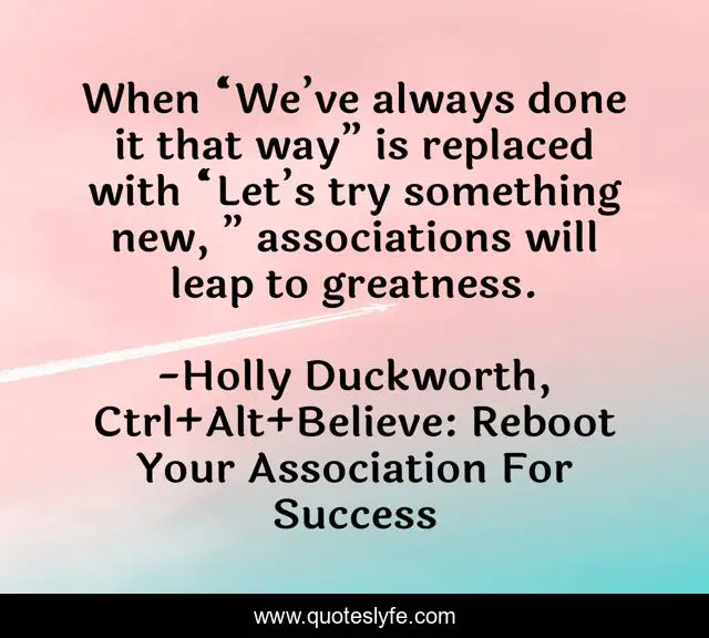 This page presents the quote "When “We’ve always done it that way” is replaced with “Let’s try something new, ” associations will leap to greatness.". Author of this quote is Holly Duckworth, Ctrl+Alt+Believe: Reboot Your Association For Success. This quote is about spirituality, spiritual, business,.