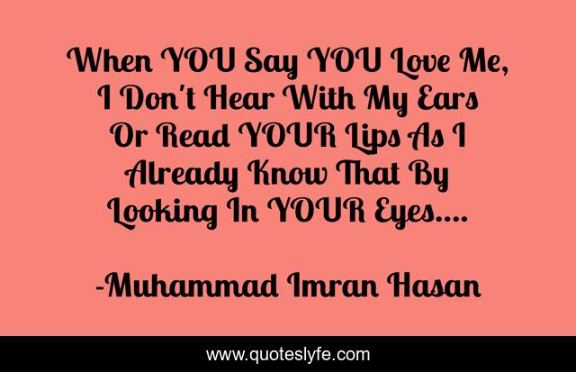 This page presents the quote "When YOU Say YOU Love Me, I Don't Hear With My Ears Or Read YOUR Lips As I Already Know That By Looking In YOUR Eyes....". Author of this quote is Muhammad Imran Hasan. This quote is about true-love, heart, eyes, love, power-of-eye, life, soul, selflessness, passion,.