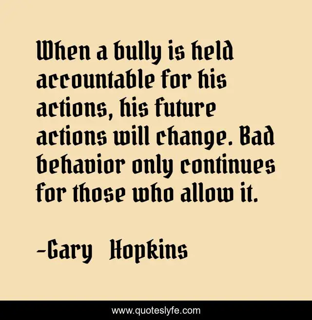This page presents the quote "When a bully is held accountable for his actions, his future actions will change. Bad behavior only continues for those who allow it.". Author of this quote is Gary Hopkins. This quote is about spiritual-growth, bad-behavior, god, accountability, bullying, spirituality, oneness, energy-healing, inspirational,.