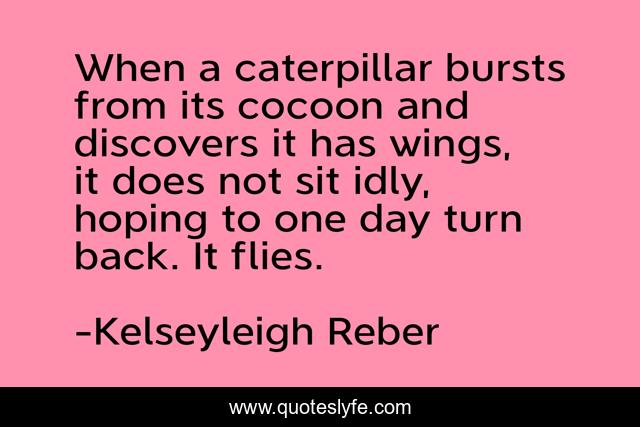 This page presents the quote "When a caterpillar bursts from its cocoon and discovers it has wings, it does not sit idly, hoping to one day turn back. It flies.". Author of this quote is Kelseyleigh Reber. This quote is about butterfly, fly, life, moving-forward-in-life, making-the-best-of-situations, philosophy, caterpillar, accepting-change, live,.