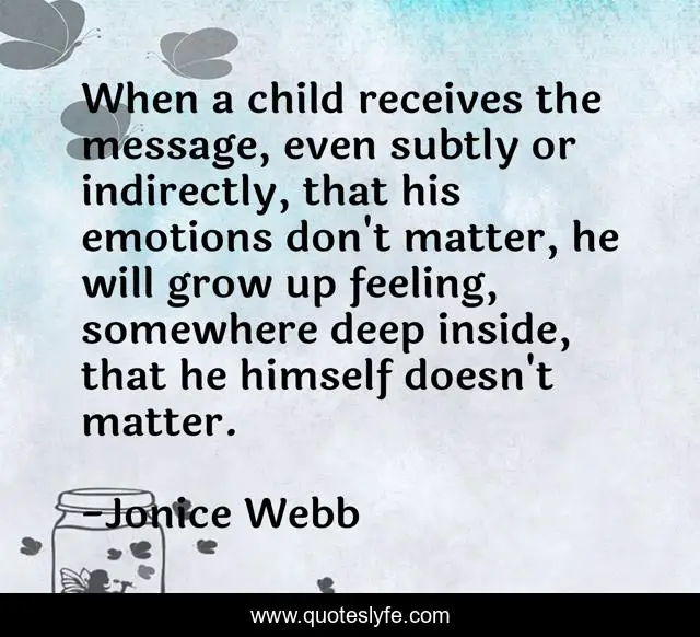 This page presents the quote "When a child receives the message, even subtly or indirectly, that his emotions don't matter, he will grow up feeling, somewhere deep inside, that he himself doesn't matter.". Author of this quote is Jonice Webb. This quote is about childhood-emotional-neglect, emptiness-in-heart, depression, lack-of-fulfillment,.