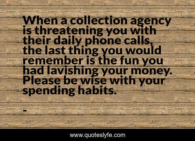 This page presents the quote "When a collection agency is threatening you with their daily phone calls, the last thing you would remember is the fun you had lavishing your money. Please be wise with your spending habits.". Author of this quote is . This quote is about your-spending-habits, edmond-mbiaka, collection-agency, lavish, lavishing-your-money, threatening-phone-calls,.