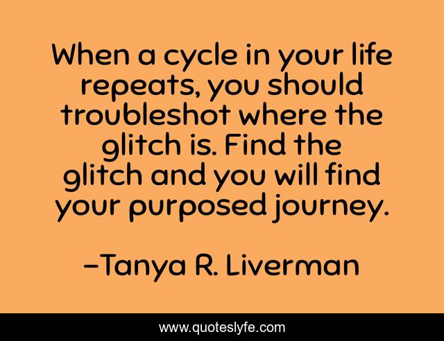 This page presents the quote "When a cycle in your life repeats, you should troubleshot where the glitch is. Find the glitch and you will find your purposed journey.". Author of this quote is Tanya R. Liverman. This quote is about confidence, inspirational, self-discovery, motivational, optimistic, life-lessons, positive, enthusiasm,.