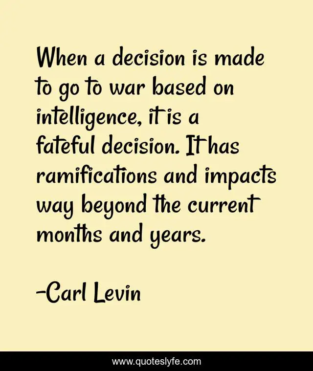 This page presents the quote "When a decision is made to go to war based on intelligence, it is a fateful decision. It has ramifications and impacts way beyond the current months and years.". Author of this quote is Carl Levin. This quote is about decision, war, way,.