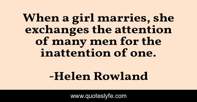 This page presents the quote "When a girl marries, she exchanges the attention of many men for the inattention of one.". Author of this quote is Helen Rowland. .