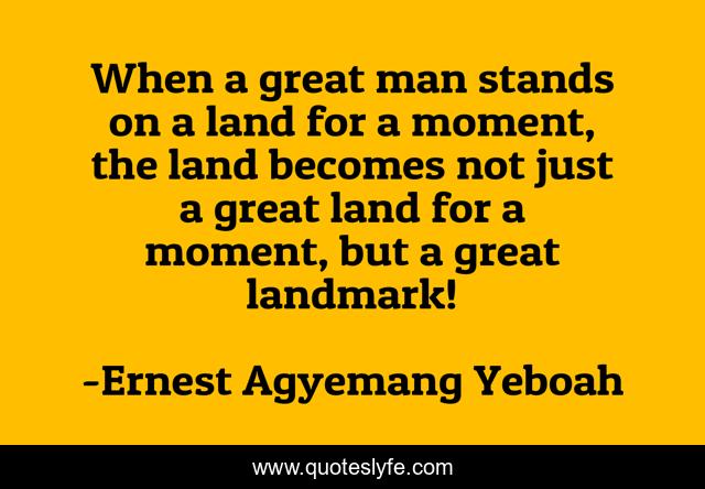 This page presents the quote "When a great man stands on a land for a moment, the land becomes not just a great land for a moment, but a great landmark!". Author of this quote is Ernest Agyemang Yeboah. This quote is about politics, great-men-and-women, landmarks, important-people, history,.