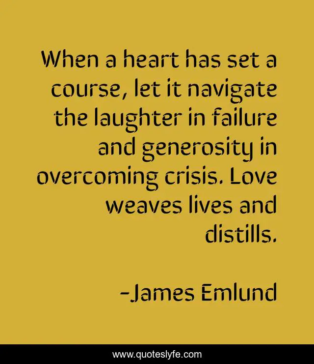 This page presents the quote "When a heart has set a course, let it navigate the laughter in failure and generosity in overcoming crisis. Love weaves lives and distills.". Author of this quote is James Emlund. This quote is about heart, love, failure-and-attitude, navigate, inspirational, enthusiasm, affection,.
