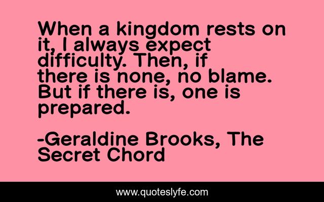 This page presents the quote "When a kingdom rests on it, I always expect difficulty. Then, if there is none, no blame. But if there is, one is prepared.". Author of this quote is Geraldine Brooks, The Secret Chord. This quote is about pragmatism, pessimism, optimism, strategy, planning, leadership,.
