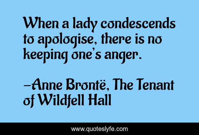 This page presents the quote "When a lady condescends to apologise, there is no keeping one’s anger.". Author of this quote is Anne Brontë, The Tenant of Wildfell Hall. This quote is about anger, apologies, women,.