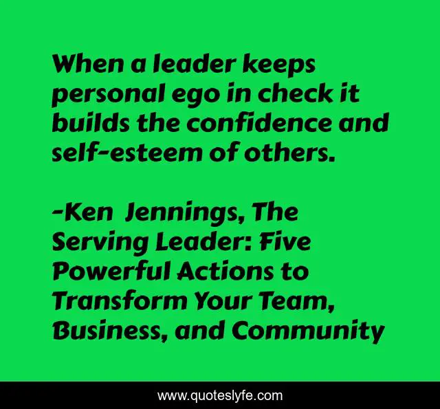 This page presents the quote "When a leader keeps personal ego in check it builds the confidence and self-esteem of others.". Author of this quote is Ken Jennings, The Serving Leader: Five Powerful Actions to Transform Your Team, Business, and Community. This quote is about ego, confidence, serving-leader, leader, self-esteem,.