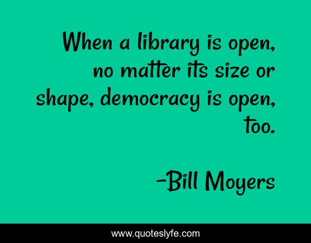 This page presents the quote "When a library is open, no matter its size or shape, democracy is open, too.". Author of this quote is Bill Moyers. This quote is about libraries, progressivism, librarianship, community, democracy,.