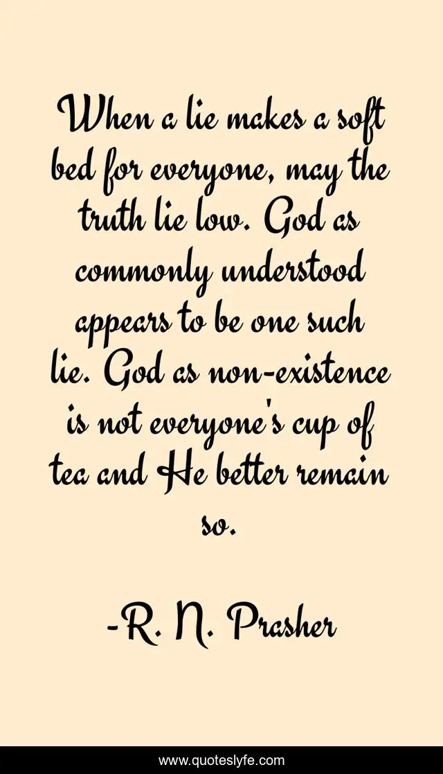 This page presents the quote "When a lie makes a soft bed for everyone, may the truth lie low. God as commonly understood appears to be one such lie. God as non-existence is not everyone's cup of tea and He better remain so.". Author of this quote is R. N. Prasher. This quote is about lie, non-existence, belief, god, reality, imagination, truth, existence,.