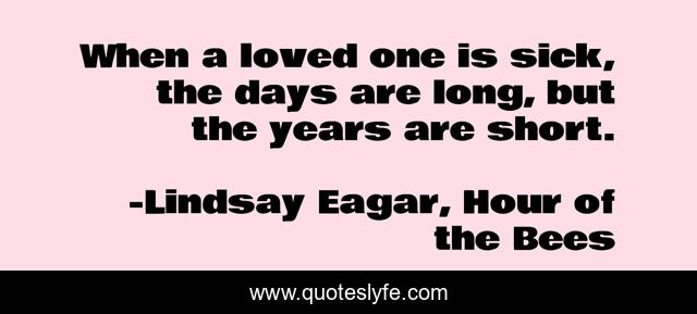 This page presents the quote "When a loved one is sick, the days are long, but the years are short.". Author of this quote is Lindsay Eagar, Hour of the Bees. This quote is about sickness-and-diseases, sad,.