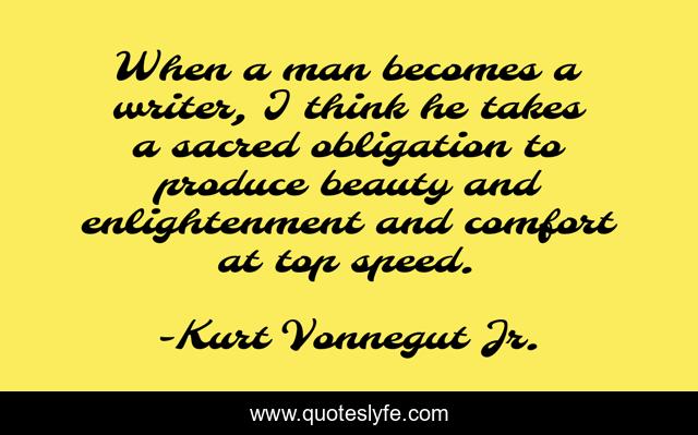 This page presents the quote "When a man becomes a writer, I think he takes a sacred obligation to produce beauty and enlightenment and comfort at top speed.". Author of this quote is Kurt Vonnegut Jr.. .