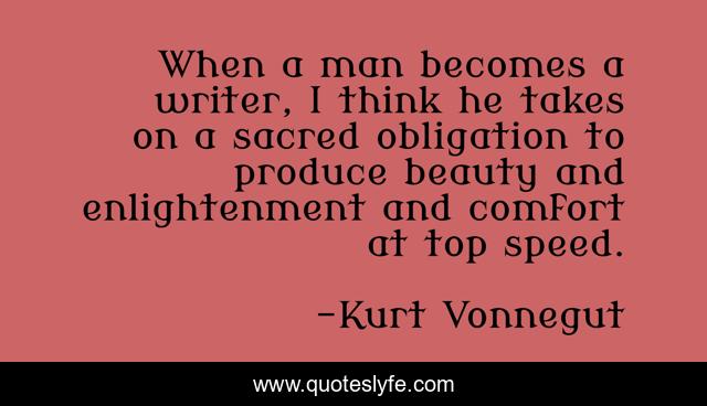 This page presents the quote "When a man becomes a writer, I think he takes on a sacred obligation to produce beauty and enlightenment and comfort at top speed.". Author of this quote is Kurt Vonnegut. This quote is about enlightenment, comfort, man,.