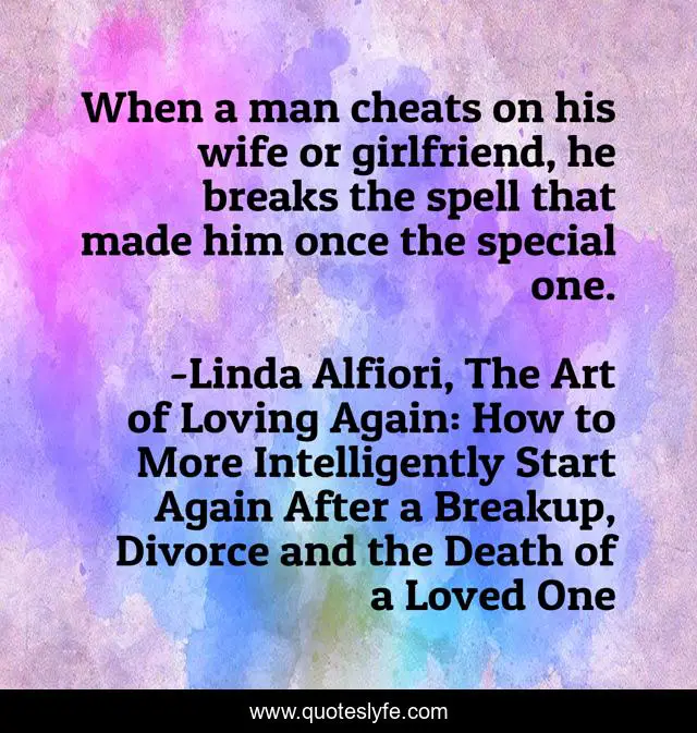 This page presents the quote "When a man cheats on his wife or girlfriend, he breaks the spell that made him once the special one.". Author of this quote is Linda Alfiori, The Art of Loving Again: How to More Intelligently Start Again After a Breakup, Divorce and the Death of a Loved One. This quote is about breakup, divorce,.