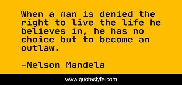 This page presents the quote "When a man is denied the right to live the life he believes in, he has no choice but to become an outlaw.". Author of this quote is Nelson Mandela. This quote is about freedom, oppression, crime,.