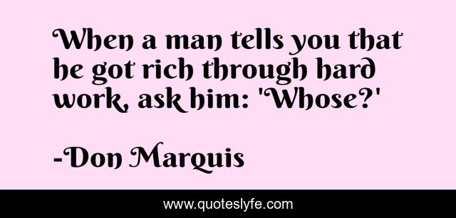 This page presents the quote "When a man tells you that he got rich through hard work, ask him: 'Whose?'". Author of this quote is Don Marquis. This quote is about hard work, rich, man,.