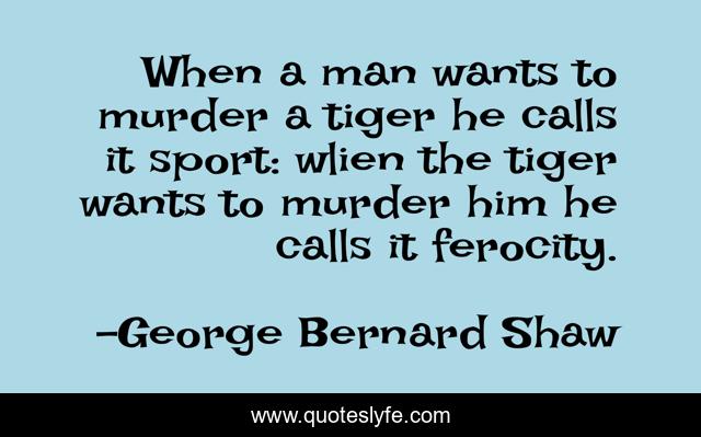 This page presents the quote "When a man wants to murder a tiger he calls it sport: wlien the tiger wants to murder him he calls it ferocity.". Author of this quote is George Bernard Shaw. .