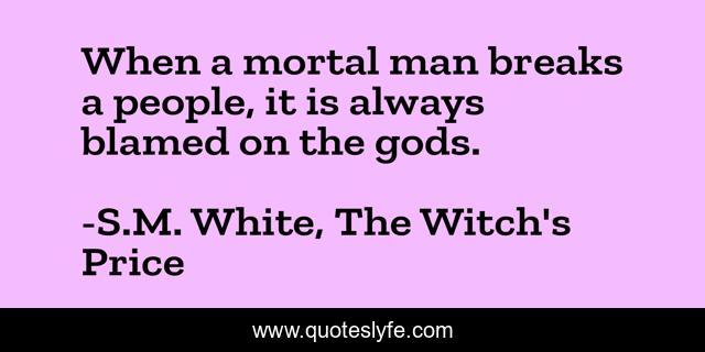 This page presents the quote "When a mortal man breaks a people, it is always blamed on the gods.". Author of this quote is S.M. White, The Witch's Price. This quote is about fantasy, epic-fantasy, sword-and-sorcery,.