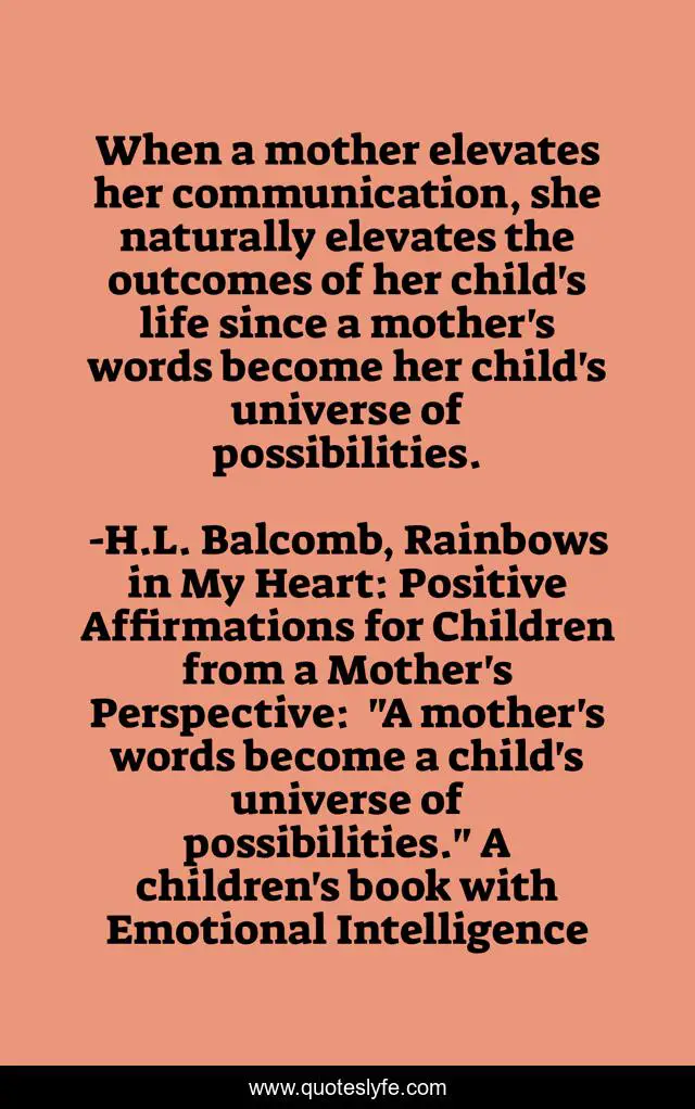 "H.L. Balcomb, Rainbows in My Heart: Positive Affirmations for Children from a Mother's Perspective: "A mother's words become a child's universe of possibilities." A children's book with Emotional Intelligence Quotes." Quoteslyfe.com, 2025. Sat. 06 Dec. 2025. <https://www.quoteslyfe.com/quote/When-a-mother-elevates-her-communication-she-80869>.