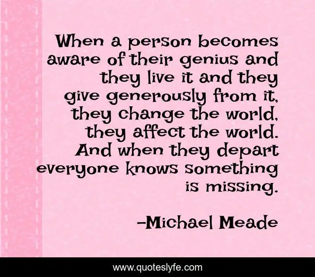 This page presents the quote "When a person becomes aware of their genius and they live it and they give generously from it, they change the world, they affect the world. And when they depart everyone knows something is missing.". Author of this quote is Michael Meade. This quote is about change-the-world, generosity, genius,.