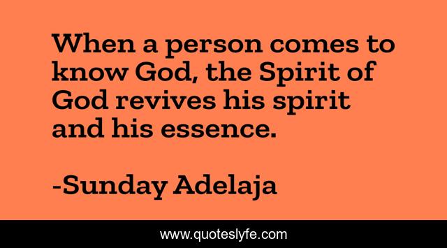 This page presents the quote "When a person comes to know God, the Spirit of God revives his spirit and his essence.". Author of this quote is Sunday Adelaja. This quote is about essence, god-revives, spirit, person,.