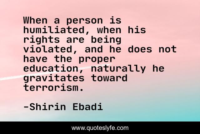 This page presents the quote "When a person is humiliated, when his rights are being violated, and he does not have the proper education, naturally he gravitates toward terrorism.". Author of this quote is Shirin Ebadi. This quote is about person, terrorism, rights,.