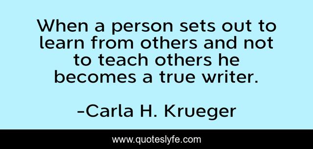 This page presents the quote "When a person sets out to learn from others and not to teach others he becomes a true writer.". Author of this quote is Carla H. Krueger. This quote is about writing-life, learning-from-mistakes, writing-tips, writing-process, carla-h-krueger, being-a-writer, krueger-author, teaching, writing-philosophy,.