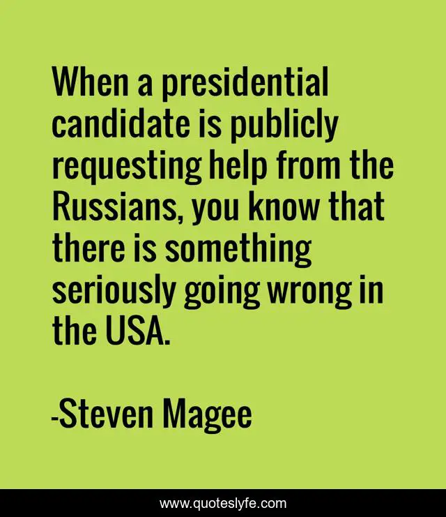 This page presents the quote "When a presidential candidate is publicly requesting help from the Russians, you know that there is something seriously going wrong in the USA.". Author of this quote is Steven Magee. This quote is about going, publicly, help, candidate, presidential-election, presidential-elections, seriously, usa, requesting,.